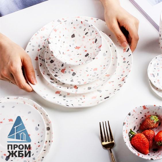 ОТГРУЗИЛИ ИЗДЕЛИЙ с 2008 года: тонн по чертежам тонн по сериям и ТУ тонн из артбетона ПосудаНеобычное решение для кухонного интерьера – посуда в стиле терраццо. Тонкостенные изделия из этого материала сделать непросто, а вот крупные монументальны предметы, такие как подносы, лотки, глубокие большие миски – вполне возможно. Кухонные принадлежности в стиле терраццо, как функциональные, так и декоративные освежат интерьер, сделают его более оригинальным. А если использовать в процессе отделки помещения плитку или столешницу, изготовленные по той же технологии – можно создать единый гармоничный ансамбль. Компания «ПромЖБИ» предлагает изготовление на заказ оригинальной посуды терраццо по индивидуальным проектам. Мы тщательно контролируем качество, а в подтверждение соответствия характеристик продукции заявленным стандартам выдаем на руки технический паспорт.